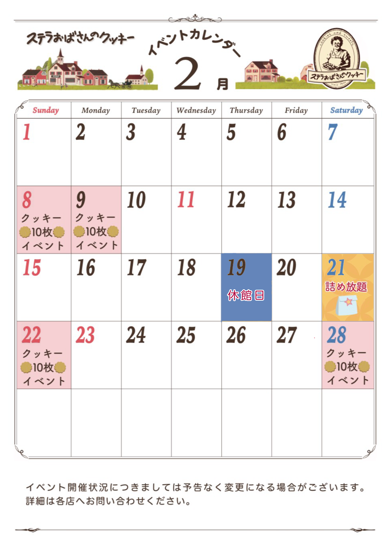 NEW 更新日:2026.01.25 ステラおばさんのクッキー 06-6646-1120 2月のお買い得イベント ※2月19日(木)の詰め放題は休館日のため2月21日(土)に開催いたします。たくさんのご来店お待ちしております! 関連キーワード #プレゼント #期間限定 #テイクアウトグルメ X この店舗のショップニュース ●2月は21日開催● 5,000円越えも夢じゃない!!クッキー詰め放題開催! 定番も季節限定もお好きなものを好きなだけ♪