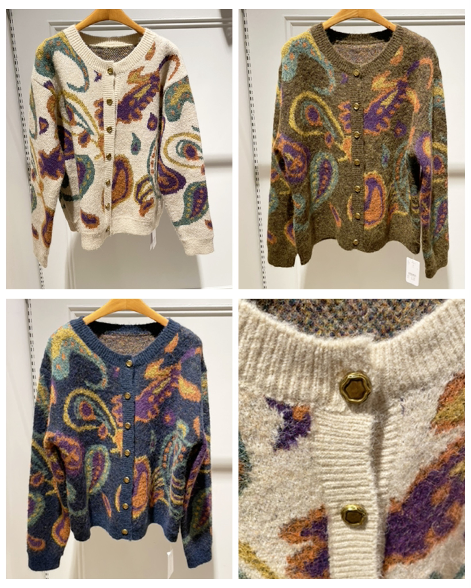 NEW 更新日:2025.10.16 anRipply 06-6646-1201 モヘアタッチペイズリー柄ニットカーディガン クラシカルな雰囲気のゴールドボタンのペーズリー柄ニットカーディガン☆ カラフルなペイズリー柄がオリエンタルな雰囲気を演出してくれます◎ ジャストなサイズ感で使い勝手も抜群、前を閉じてプルオーバー風にも、羽織としても使えてコーディネートの幅が広がります! オンラインストア インスタグラム 関連キーワード #記念日 #プレゼント #新商品 #コーデ #お出かけ X この店舗のショップニュース スエードポンチジップブルゾン※セットアップ対応 スエードポンチフライトジャケット※セットアップ対応 シャツレイヤードプルオーバー MIXミニループヤーンニットスカート※セットアップ対応 MIXミニループヤーンニットベスト※セットアップ対応 ラガーシャツ ベルトスリーブプルオーバー スエードポンチIライントラックスカート フェイクファー2wayショルダーバッグ ボリュームスリーブプルオーバー
