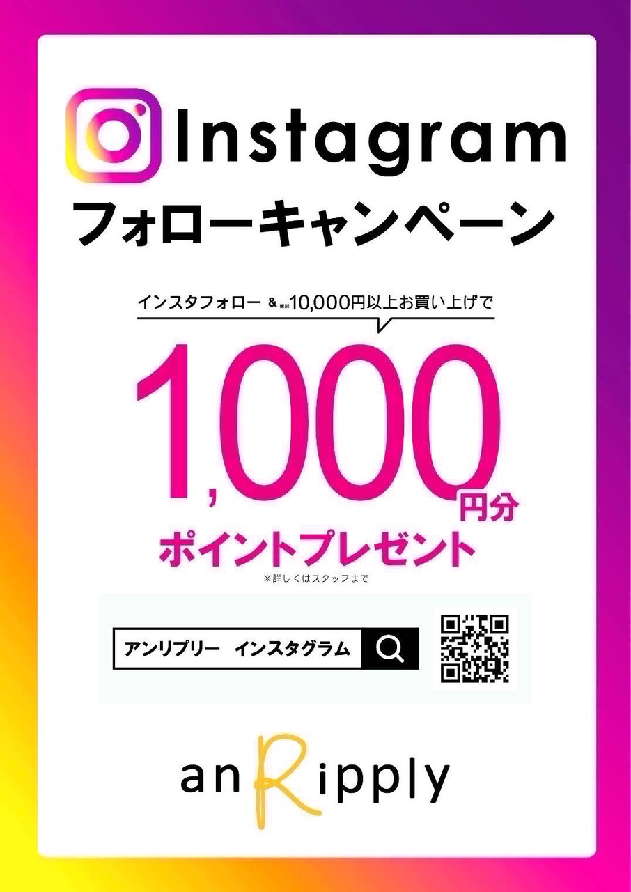 NEW 更新日:2025.10.17 anRipply 06-6646-1201 Instagramフォローキャンペーン開催 ✨Instagramフォローキャンペーン開催✨ 10/16(木)〜11/3(月祝) インスタフォロー➕10,000円(税別)以上お買い上げで自店メンバーズカード1,000ポイントプレゼント‼️???? 是非この機会にお越し下さいませ???? スタッフ一同お待ちしております???? オンラインストア インスタグラム 関連キーワード #記念日 #プレゼント #新商品 #コーデ #お出かけ X この店舗のショップニュース フェイクファートートバッグ モヘアタッチペイズリー柄ニットカーディガン スエードポンチジップブルゾン※セットアップ対応 スエードポンチフライトジャケット※セットアップ対応 シャツレイヤードプルオーバー MIXミニループヤーンニットスカート※セットアップ対応 MIXミニループヤーンニットベスト※セットアップ対応 ラガーシャツ ベルトスリーブプルオーバー スエードポンチIライントラックスカート