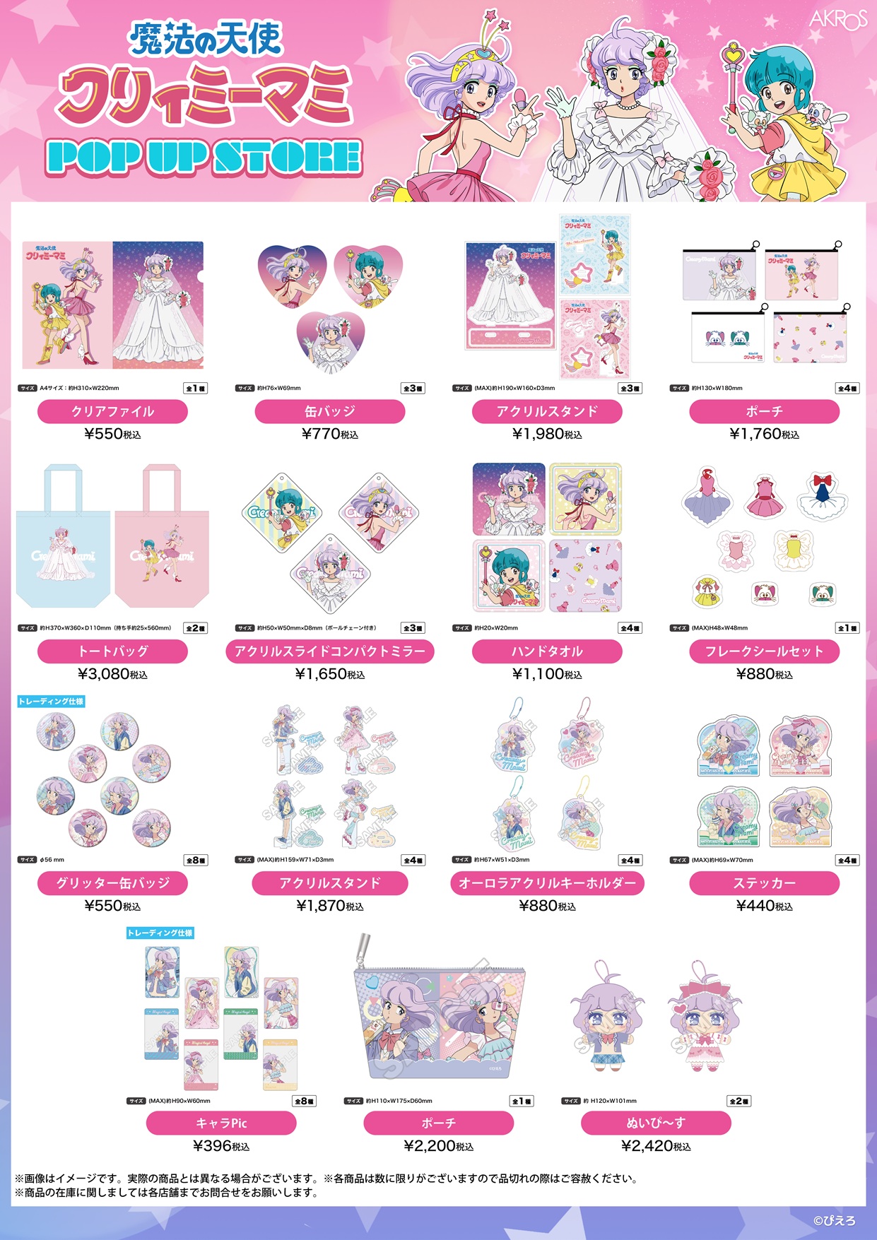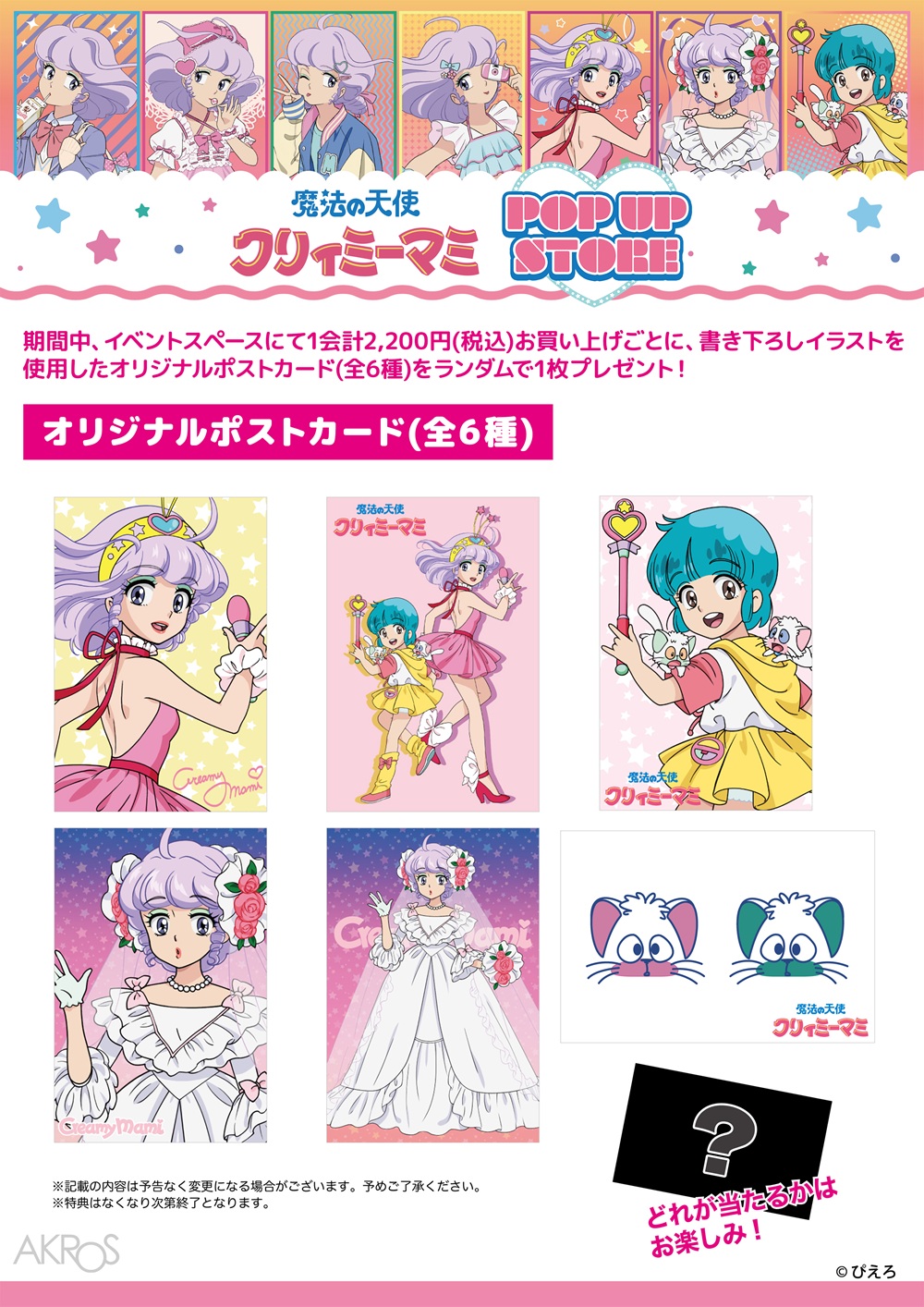 1983年に放送され、今も多くのファンに愛され続ける伝説の魔法少女アニメ『魔法の天使クリィミーマミ』。今回は作中に登場したウェディング姿のマミをメインビジュアルに、人気のエンディングコスチュームのマミと優や、80~90年代のポップカルチャーをイメージしたマミの新規描き下ろしイラストを使用した、ファッション性あふれる新作グッズを多数販売。作品を懐かしむ世代から若い世代まで楽しめるPOP UP STOREです。