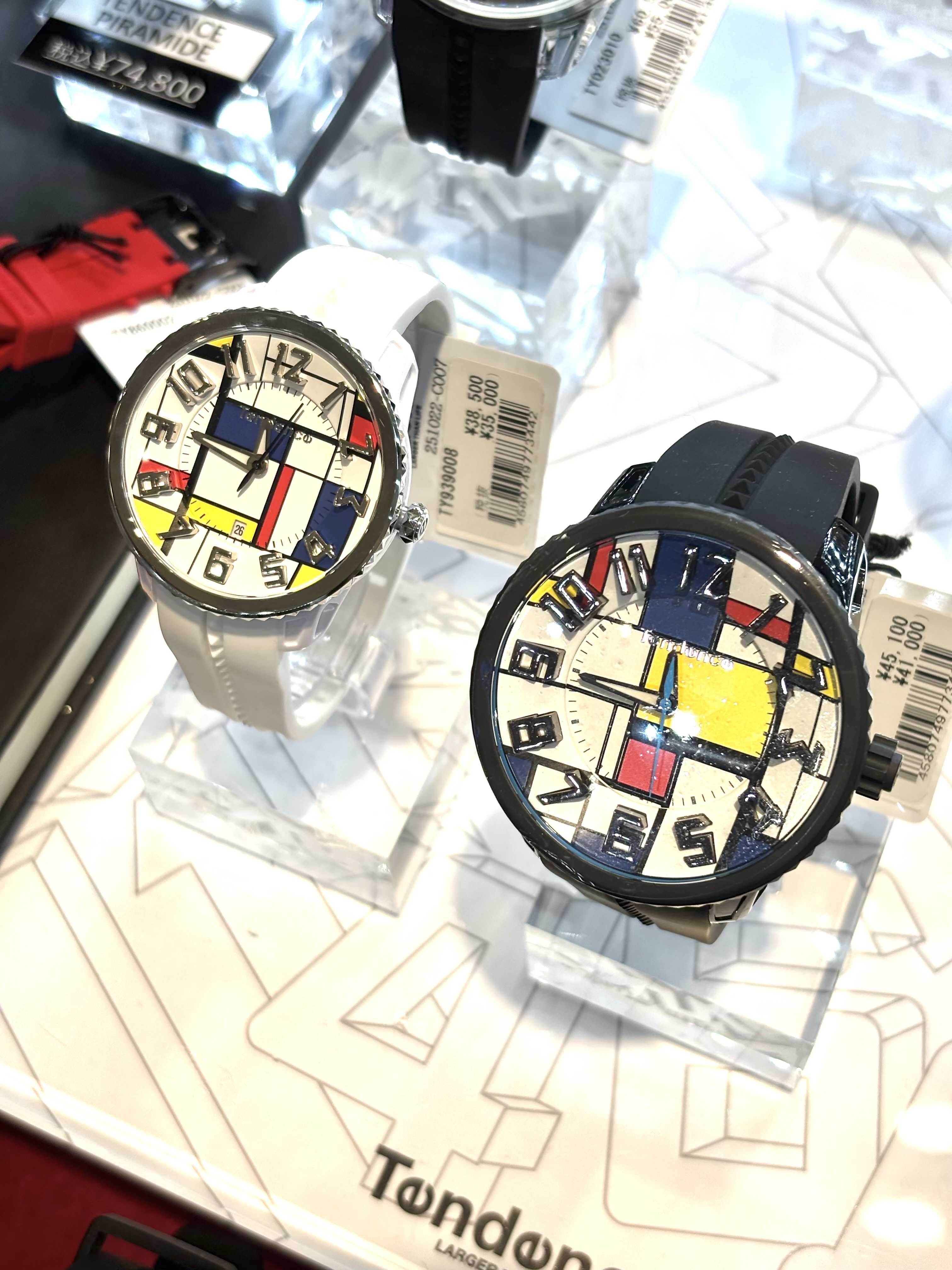 ピート・モドリアンの41mmモデル(左)と50mmモデル(右)でペアウォッチにも最適。(左)品番:TY939008 価格:¥38,500(税込)