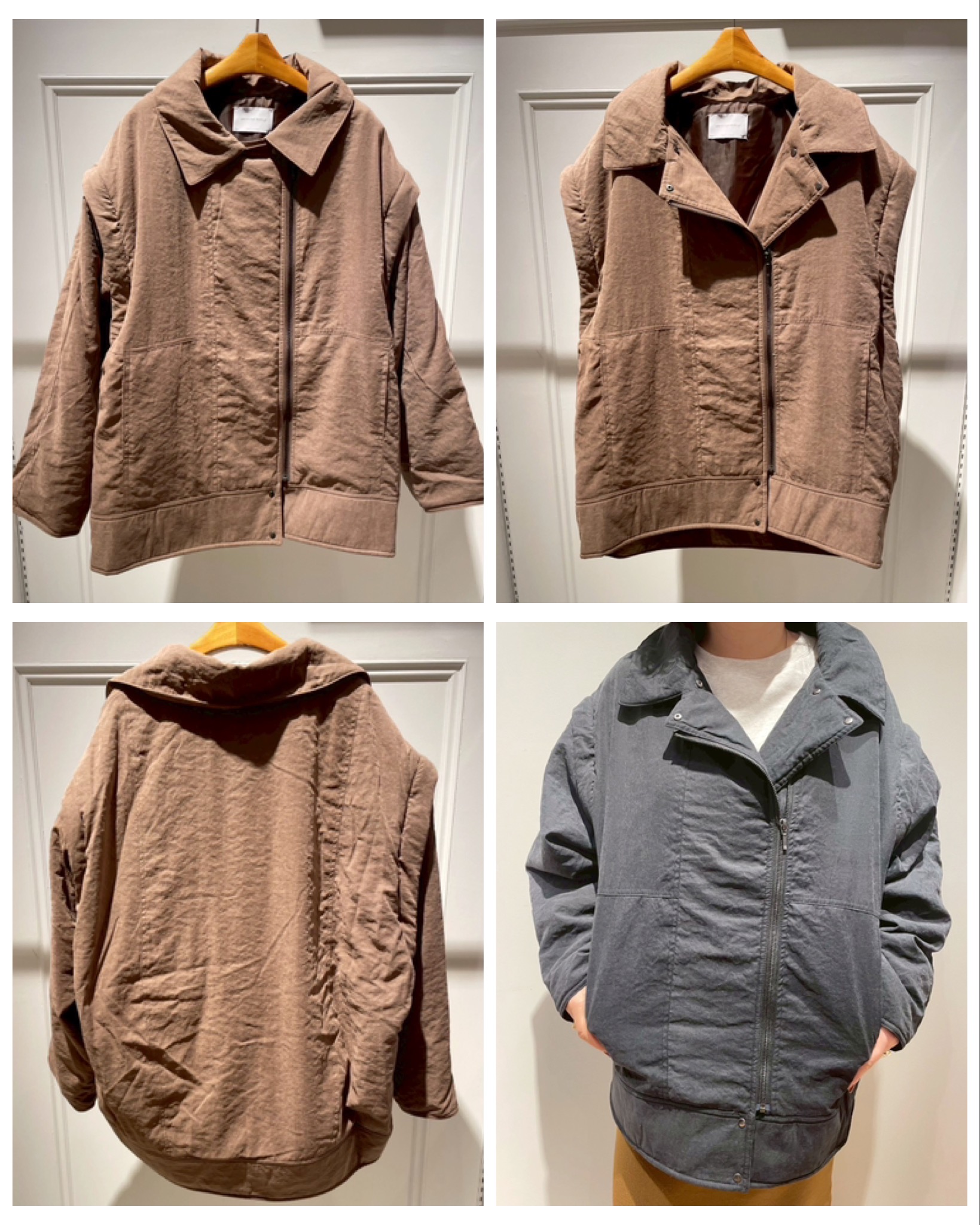 NEW 更新日:2025.12.02 anRipply 06-6646-1201 袖取り外しオーバーライダース 袖取り外し2WAYの中綿コートが登場! ベストとしても使える万能アイテム。フロントを開けるとライダースデザインになります。 袖はファスナーでの取り外しです。 アームホールは広めに設定しているので厚着も可能です。 バックスタイルはほんのりコクーンで立体感を出してくれます◎ オンラインストア インスタグラム 関連キーワード #記念日 #プレゼント #新商品 #期間限定 #コーデ #お出かけ X この店舗のショップニュース 「Voila」ロゴプルオーバー ☆インスタLIVE☆ フェイクレザーオーバーコート フェザージャガードニットプルオーバー フェイクスエードスタッズバッグ シャギーボーダーニット フリンジニットプルオーバー レイヤードロゴプルオーバー 襟付き3WAYリバーシブルキルトファーブルゾン レザーライダービッグカラージャケット