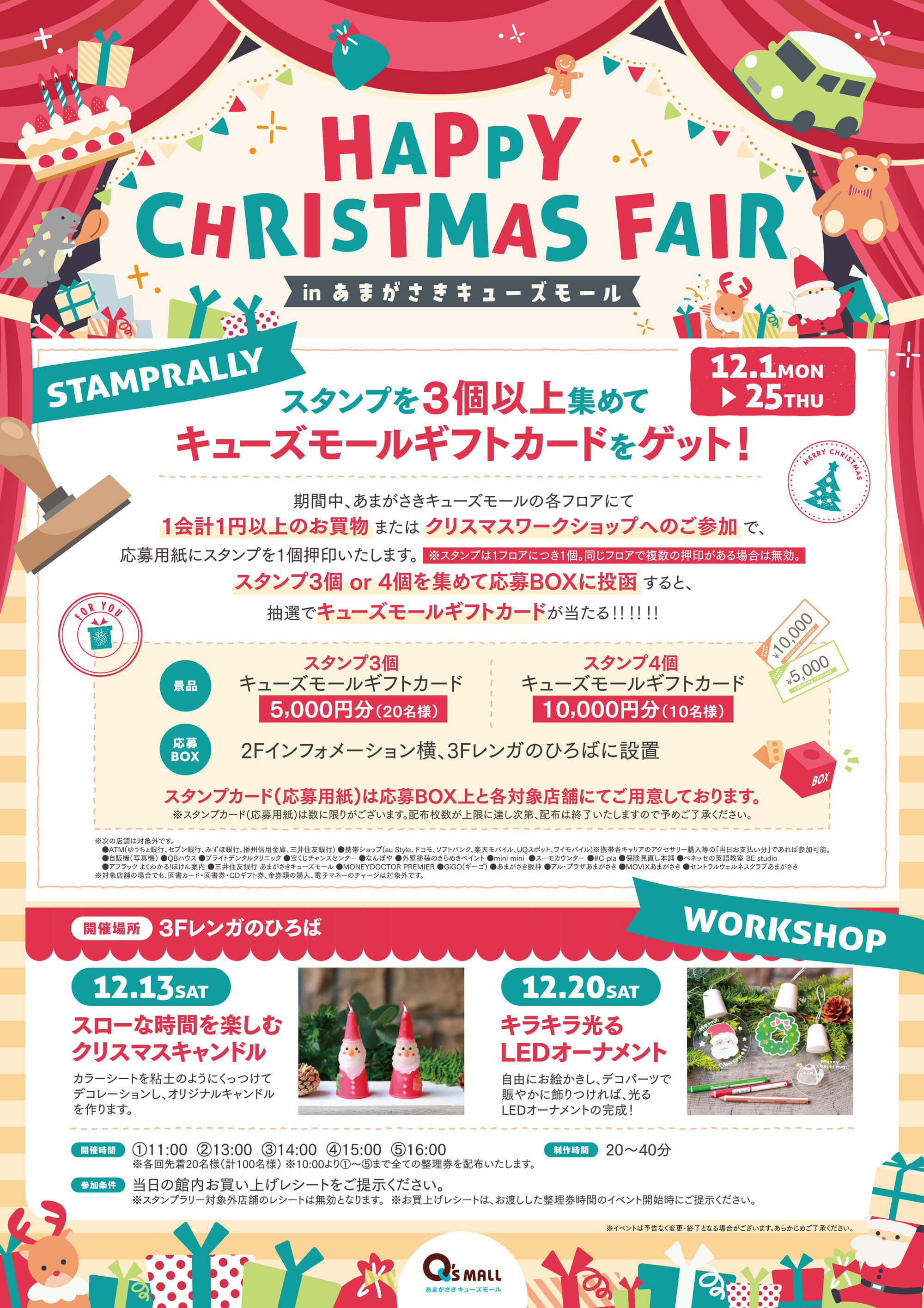 期間中(12/1~12/25)、あまがさきキューズモールの1F~4Fまでの各フロアにて1円以上お買物いただくか、12月中に2日間開催するクリスマスワークショップへのご参加で、応募用紙にスタンプを1個押印いたします。