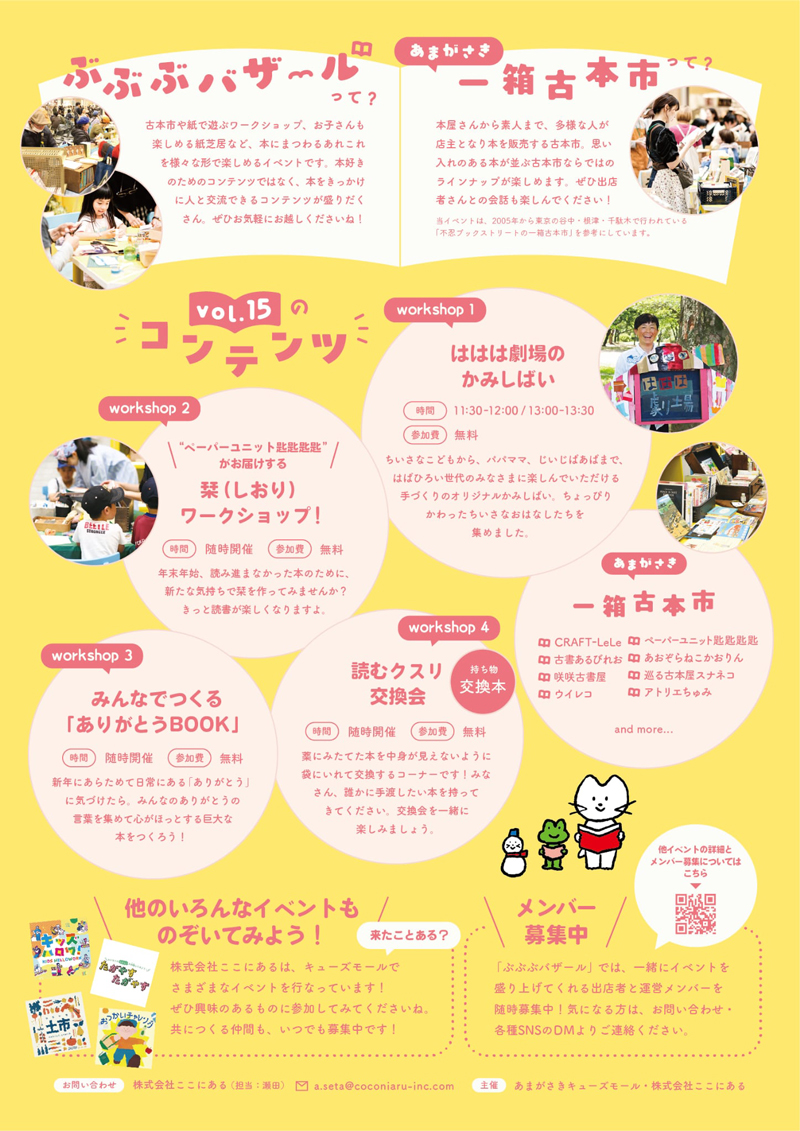古本市や紙で遊ぶワークショップ、お子さんも楽しめる紙芝居など、本にまつわるあれこれを様々な形で楽しめるイベントです。本好きのためのコンテンツではなく、本をきっかけに人と交流できるコンテンツが盛りだくさん。ぜひお気軽にお越しくださいね!