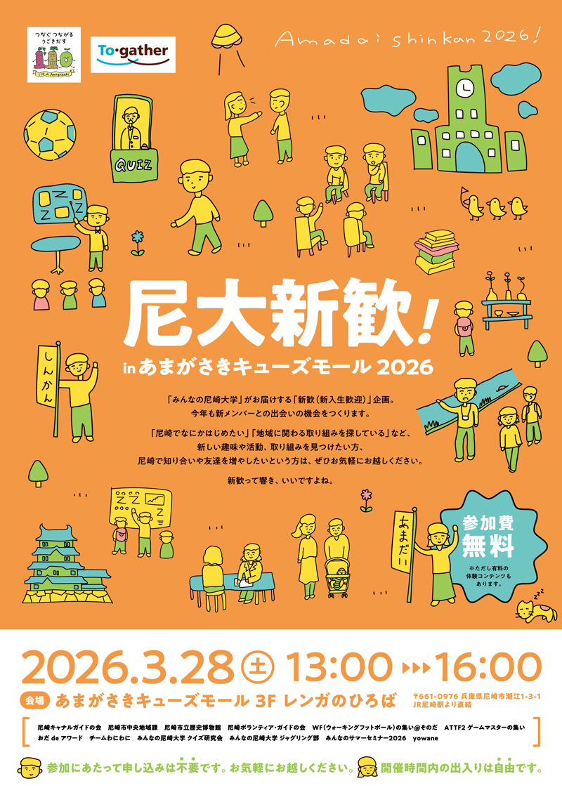 「みんなの尼崎大学」がお届けする「新歓(新入生歓迎)」企画。今年も新メンバーとの出会いの機会をつくります。「尼崎でなにかはじめたい」「地域に関わる取り組みを探している」など、新しい趣味や活動、取り組みを見つけたい方、尼崎で知り合いや友達を増やしたいという方は、ぜひお気軽にお越しください。