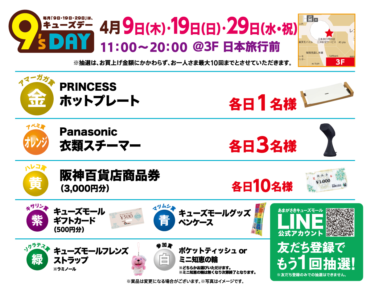当日のあまがさきキューズモールでのお買物レシートの合計金額5,000円(税込・合算可)ごとに1回抽選いただけます。