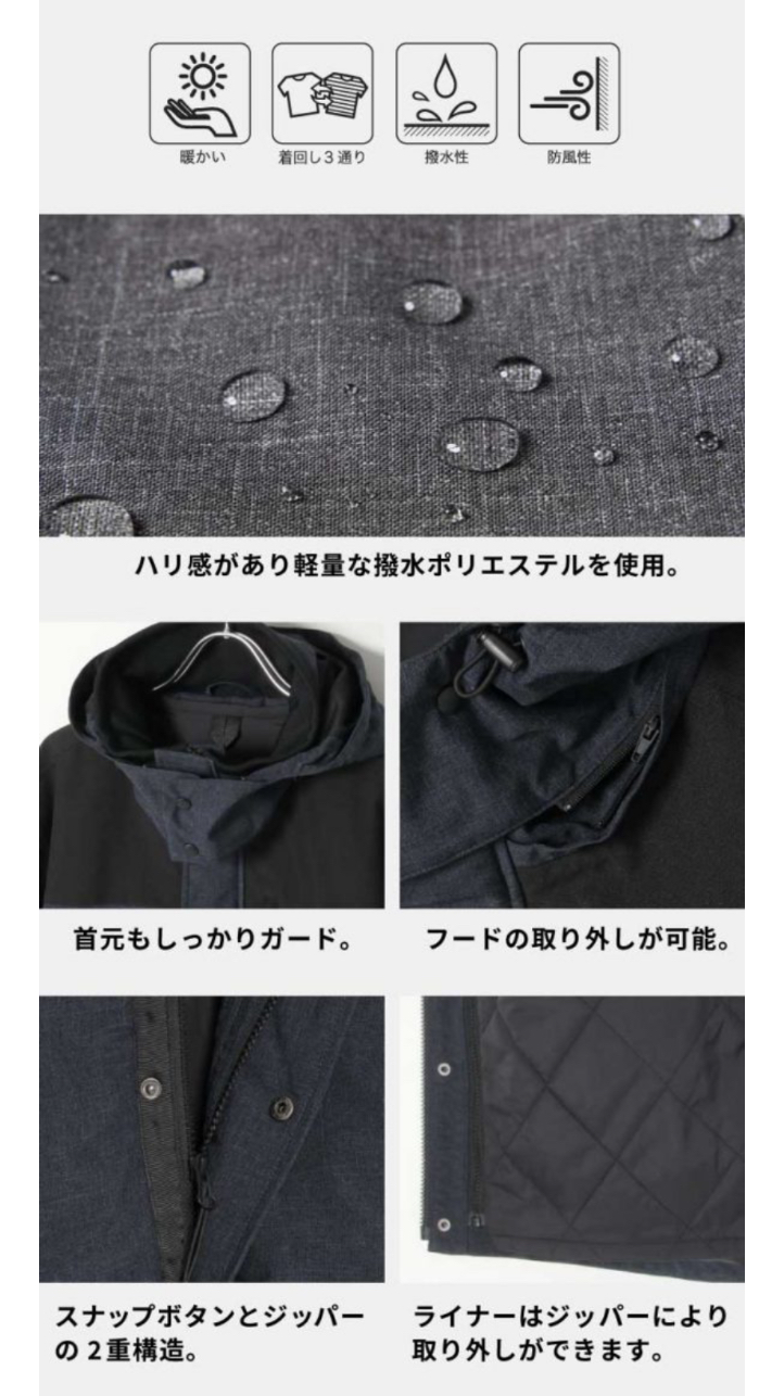 今すぐ活躍!!ライナーの着脱で気温やシーンに合わせた3通りの着こなしが可能。