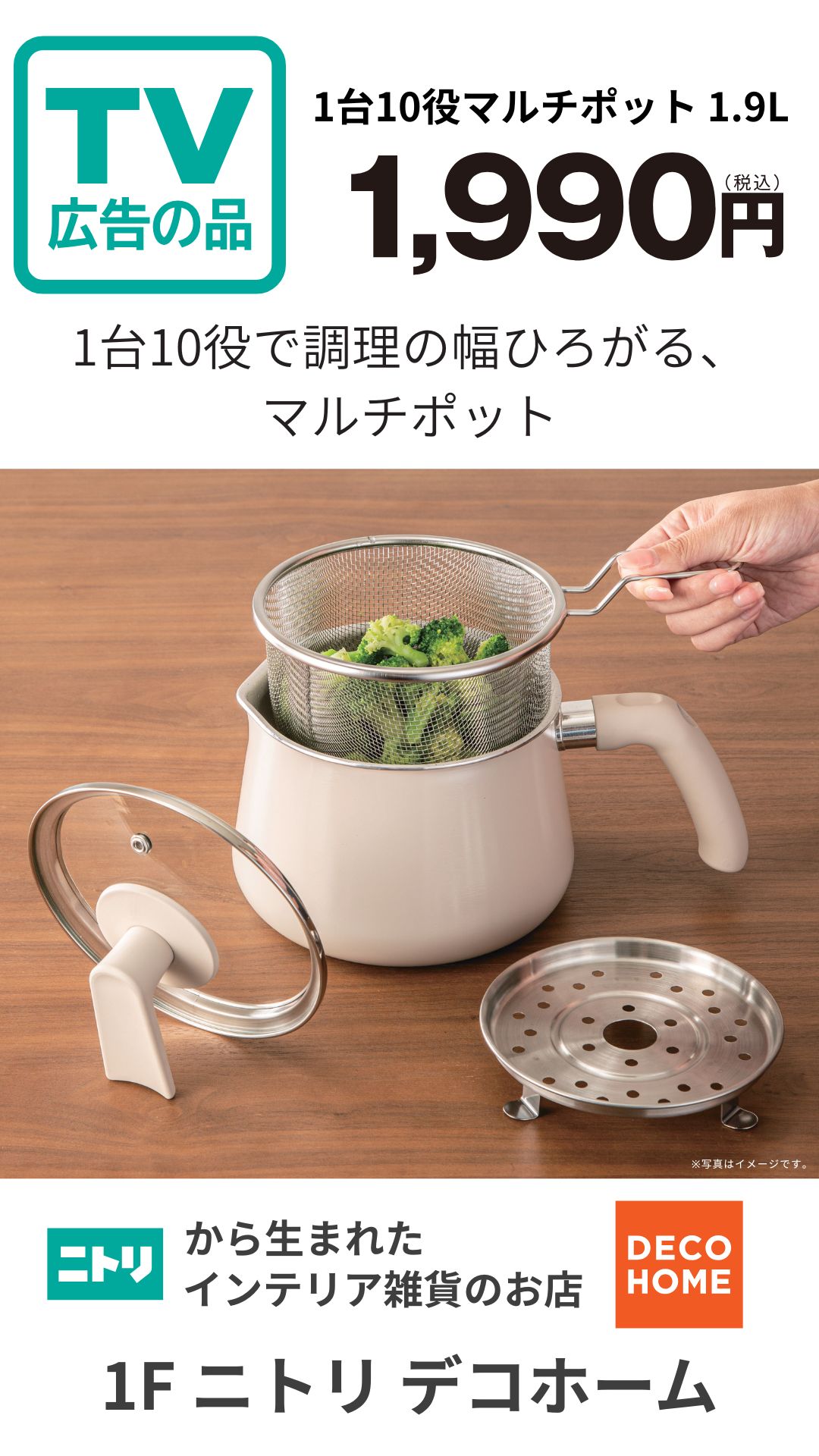NEW 更新日:2025.10.31 ニトリ デコホーム 0120-014-210 【TVCMシリーズ商品】1台10役マルチポット 1.9L 実施日時 2025/10/31 蒸し器パーツ付きが新しい、10種類の調理に対応する便利グッズ。ストレーナーも自立するからより使いやすい! X この店舗のショップニュース クリスマス気分を盛り上げるクッション エレガントなピンクのヌードツリー ニトリアプリに新規入会・購入で500ポイント! TVCM公開中!両面使えるNウォームBOXパッド! 超保湿寝具「Nモイスト」シリーズ 可愛らしいリボン柄「リボンラティス」