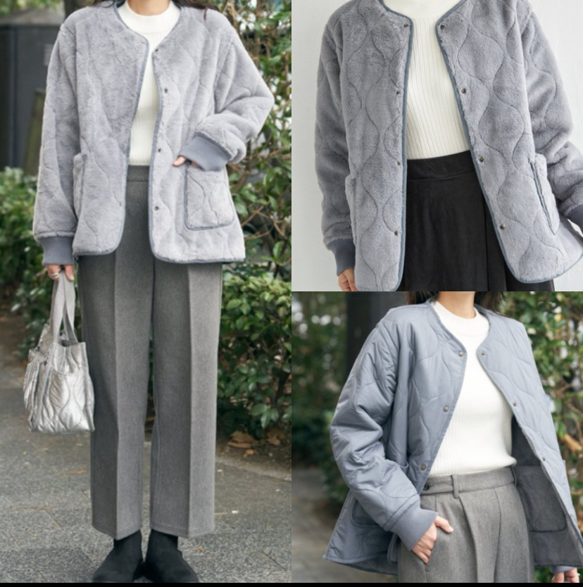 すっきりとしたキルト面と、ふんわりあたたかなフェイクファー面のリバーシブル仕様で、着こなしの幅がぐっと広がります。