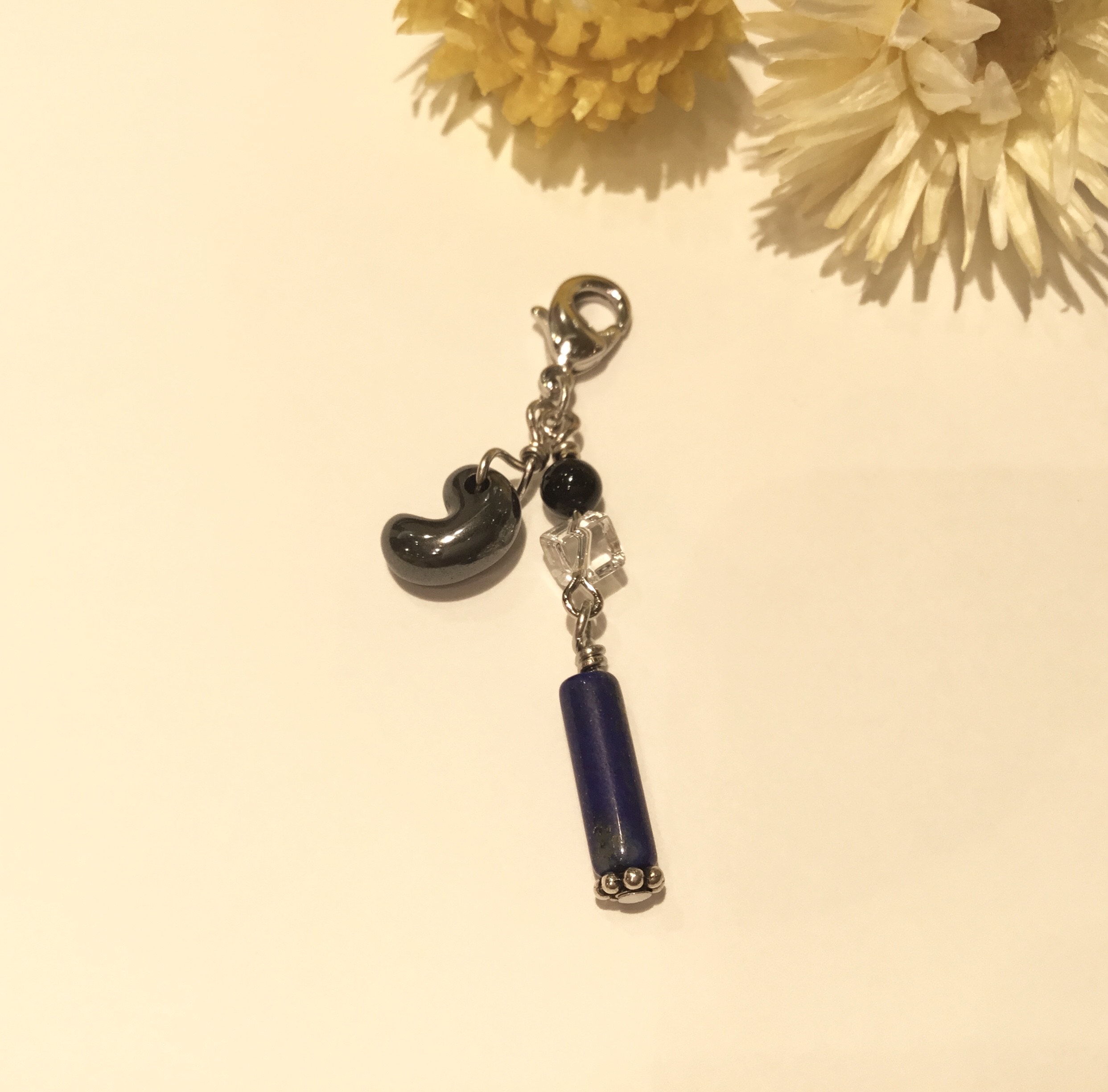水色のガラスビーズやラピスラズリも入り、爽やかな色合いのチャームです
