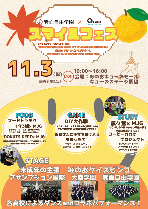 11月3日(月・文化の日)、箕面自由学園高等学校の生徒が企画・運営する「みのおスマイルフェス」を開催します!