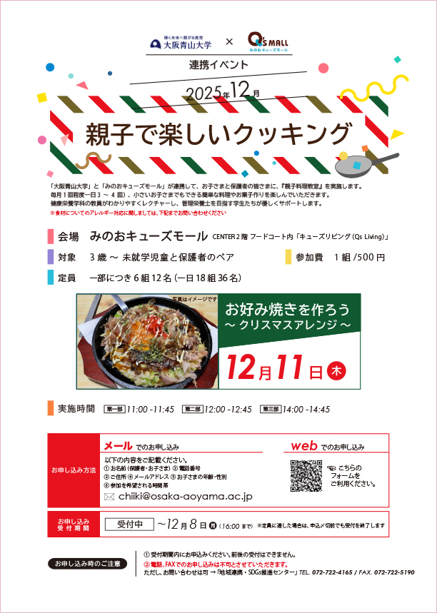 「大阪青山大学」と「みのおキューズモール」が連携して、お子様と保護者の皆さんが一緒に楽しめる『親子料理教室』を実施いたします。