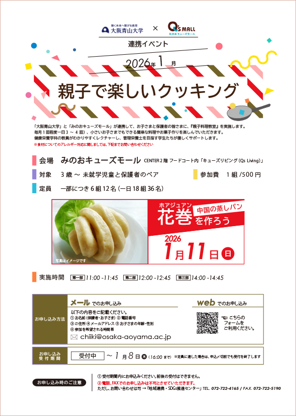 「大阪青山大学」と「みのおキューズモール」が連携して、お子様と保護者の皆さんが一緒に楽しめる『親子料理教室』を実施いたします。