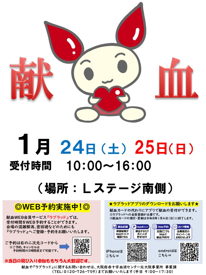 ※コロナ対策として、ラブラッド会員による「事前予約」を行っています。 (献血当日は「事前予約」の方を優先して案内する場合がございます。ご了承ください。)