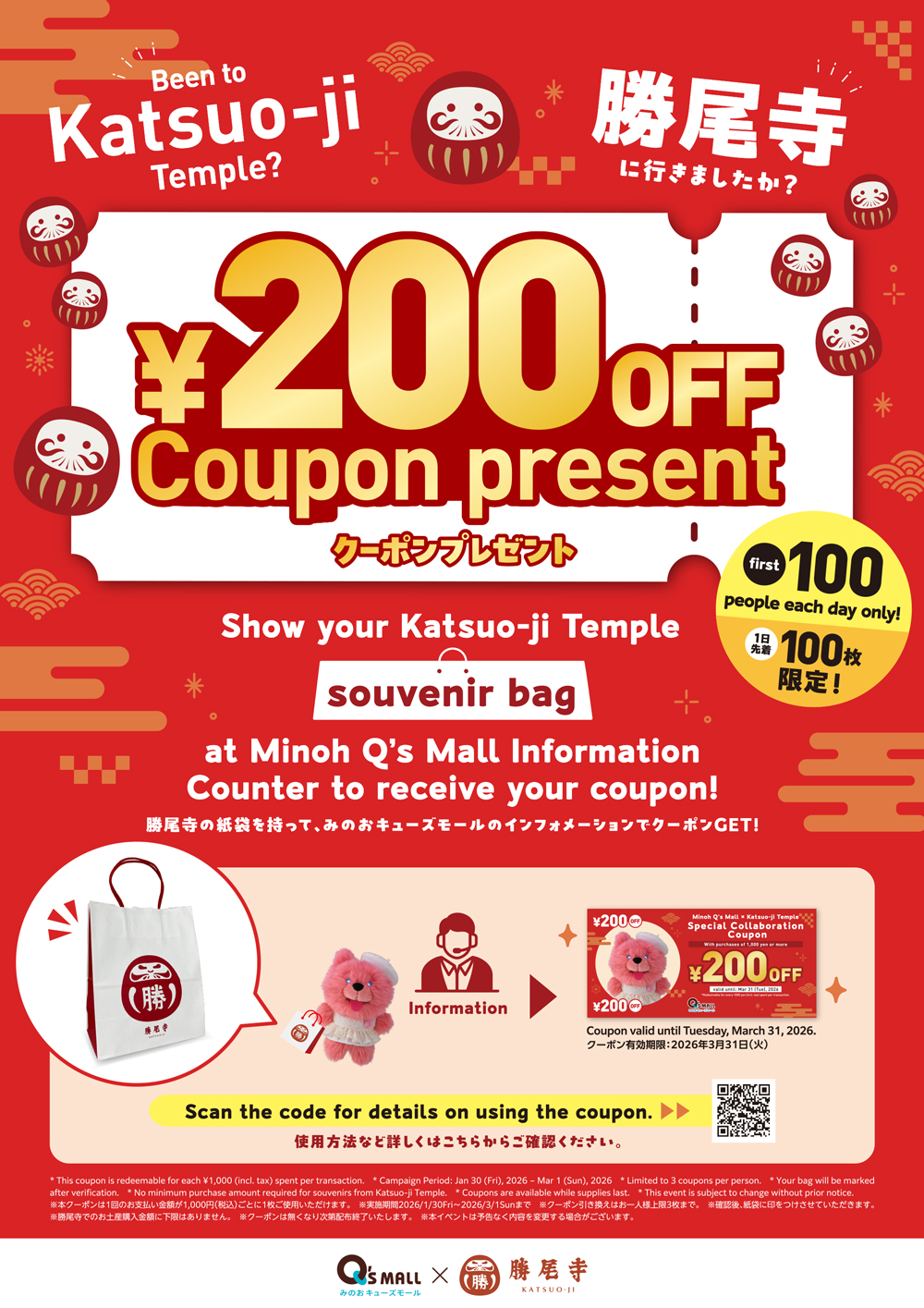 勝尾寺の紙袋を持って、みのおキューズモールのインフォメーションカウンターへお越しいただくと、お買い物時に使えるお得なクーポンを差し上げます !