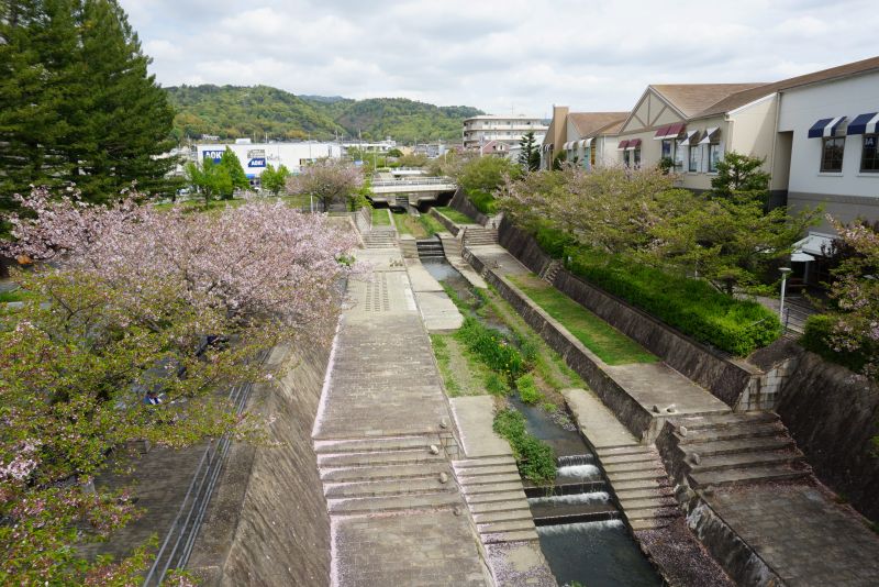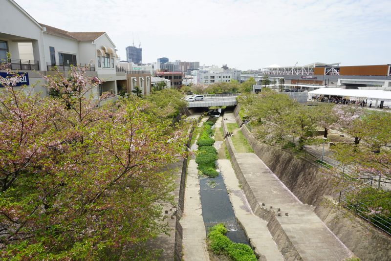 施設北側、千里川沿いでは、早咲きの桜の花びらが少しずつ散り始め、やわらかな葉が顔をのぞかせています。