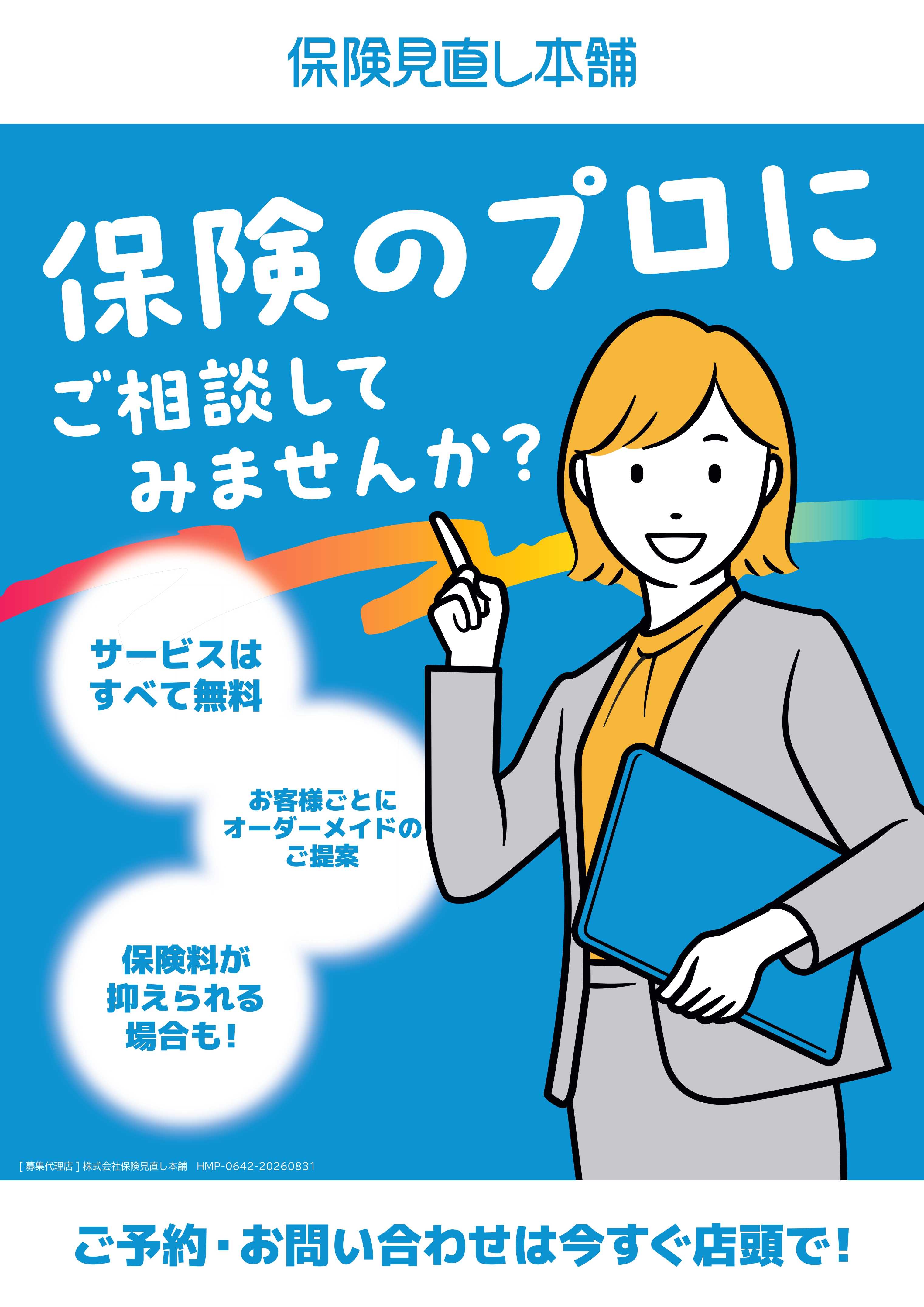 「保険の見直し」 はもちろん「新規で加入」をご検討されている方も「ご提案」「ご加入手続き」 「アフターフォロー」など各種サービスは全て無料です。