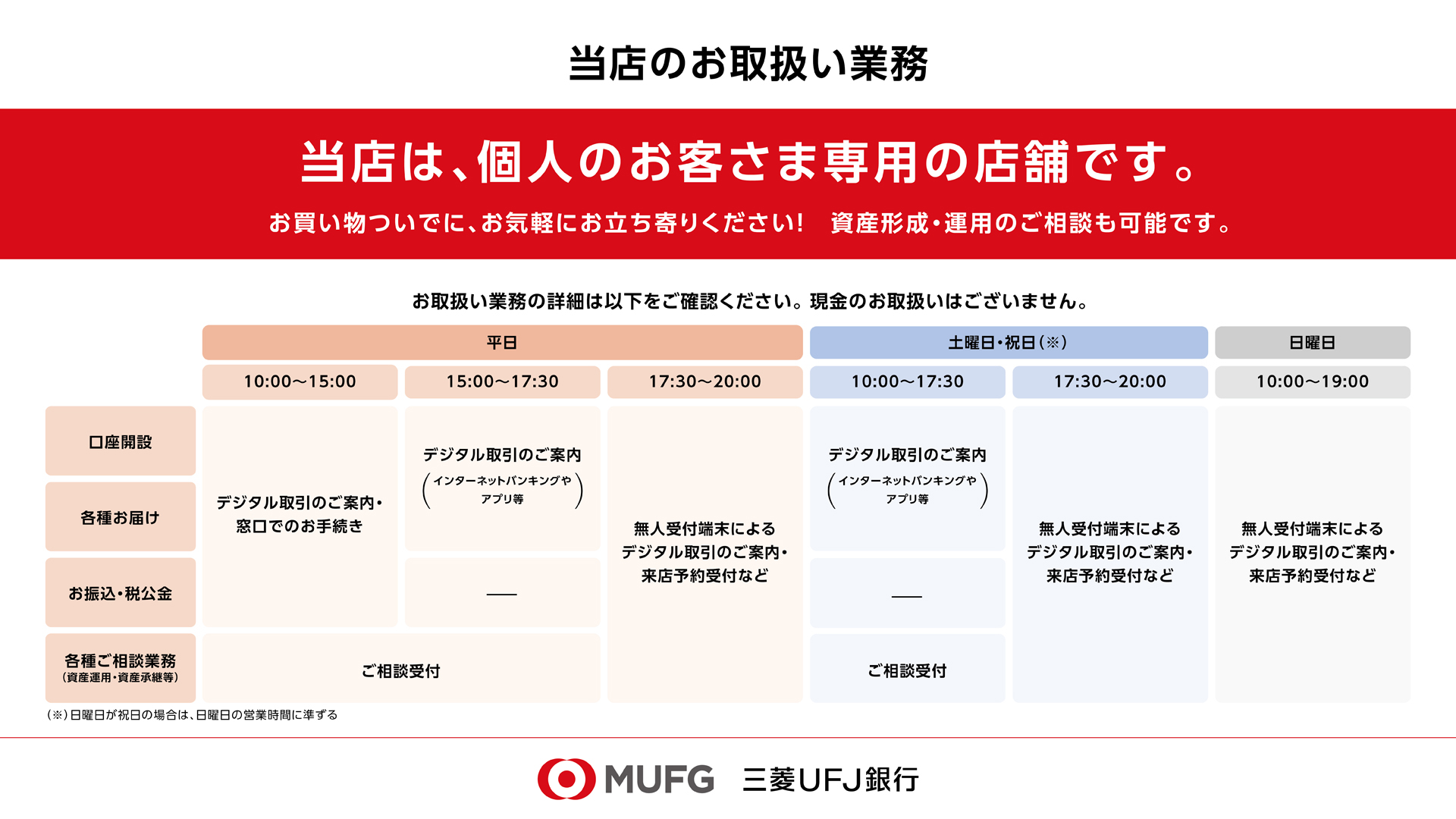 営業時間毎の取扱いサービスの詳細はこちらをご確認ください