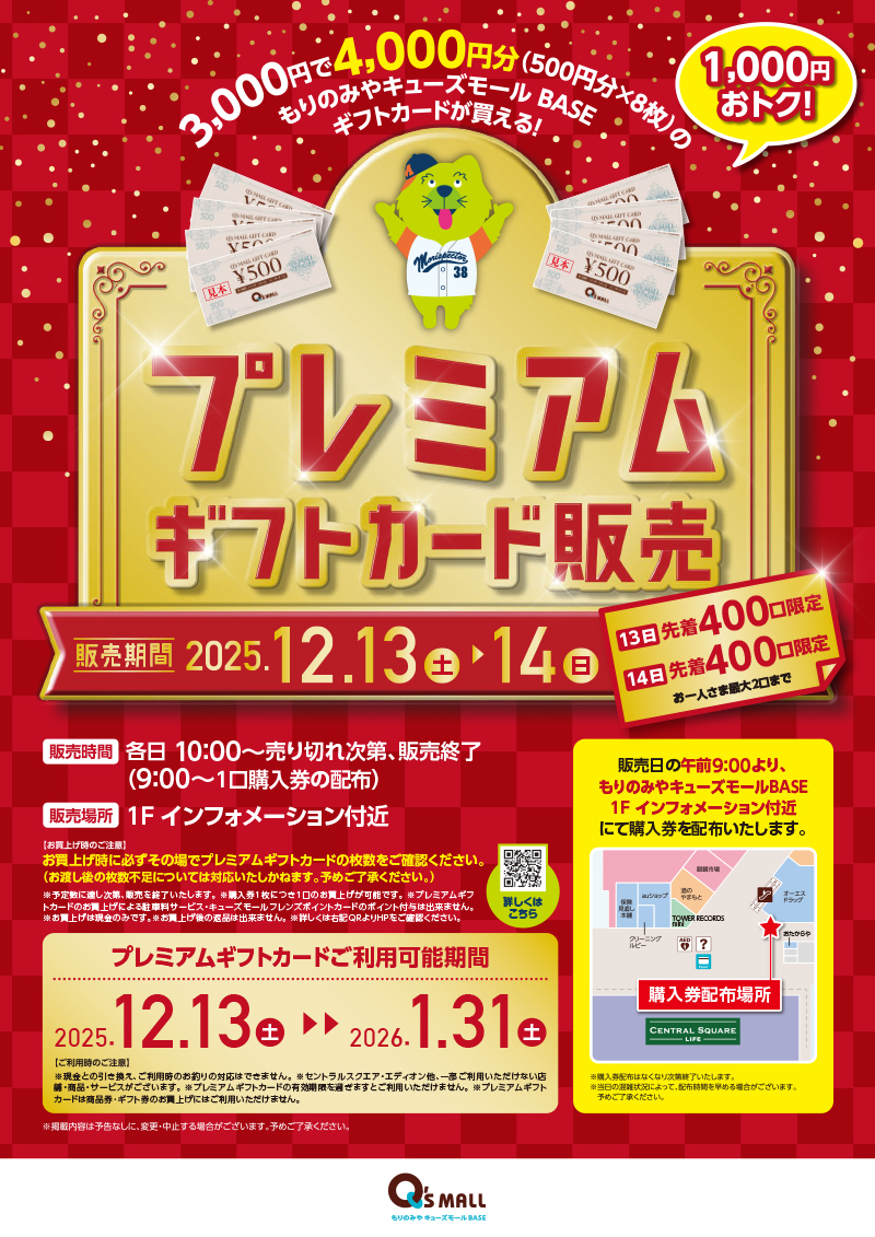 ※プレミアムギフトカードのお買上げによる駐車料サービス・キューズモールフレンズポイントカードのポイント付与は出来ません。