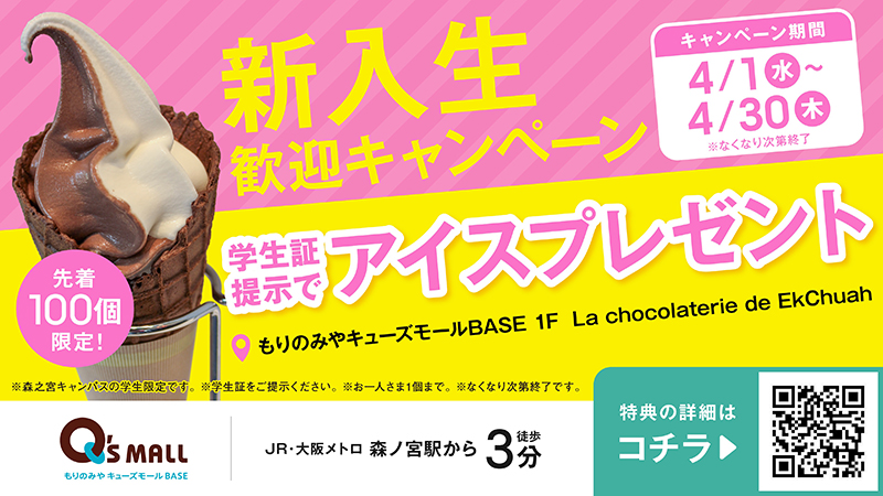 新入生歓迎キャンペーンとして、4月1日(水)~4月30日(木)の期間に、1F La chocolaterie de EkChuahにて学生証を提示いただくとアイスプレゼント!