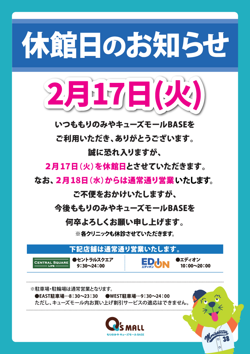 ご不便をおかけいたしますが、今後ももりのみやキューズモールBASEを何卒よろしくお願い申し上げます。