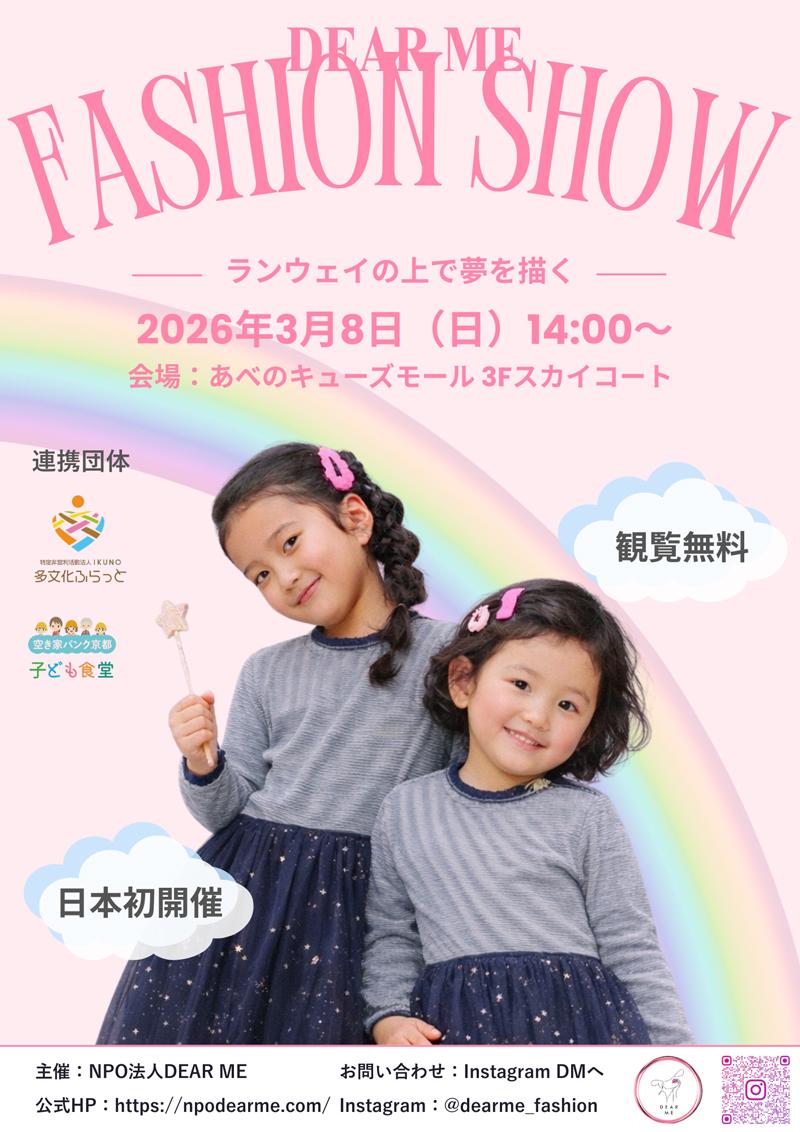 フィリピンを拠点に活動するNPO法人DEAR MEは、団体初となる日本でのファッションショーをあべのキューズモール3Fスカイコートにて開催いたします。