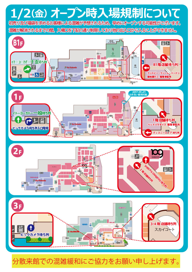 NEW 更新日:2025.12.29 1/2(金)オープン時の入場規制について 大きい画像を見る(PDF)⇒ オープン時入場規制について 初売り及び福袋を求めるお客様による混雑が予想されるため、早めにオープンする可能性がございます。 混雑が解消されるまでの間、入場口を上記の通り制限しており他の出入口から入ることができません。 分散来館での混雑緩和にご協力をお願い申し上げます。 PDFファイルを見る X 施設からのお知らせ一覧へ