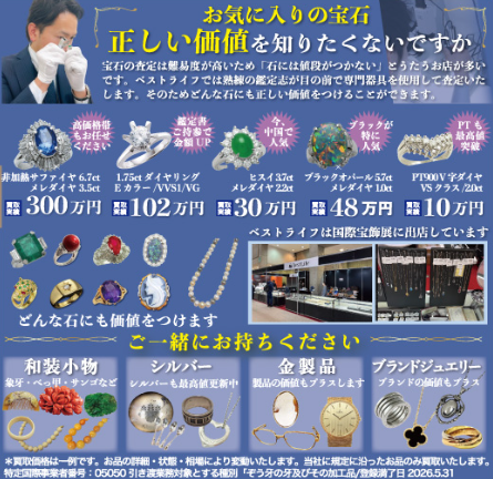 NEW 更新日:2025.11.08 ベストライフ 0120-43-0308 宝石はベストライフへ♪ お気に入りの宝石、正しい価値を知りたくありませんか 最近使わなくなってしまった ご家族様から譲り受けたけど価値が分からない そんなジュエリーはありませんか? ベストライフでは宝石もしっかりと評価、現在の適正な価値をお伝えいたします ご売却なら金・プラチナ価格が上がっている今がチャンス 詳しくはHPをご覧ください(^^)v ベストライフHP 来店予約 X この店舗のショップニュース 金券買取いたします♪ 切手の買取はお任せください♪