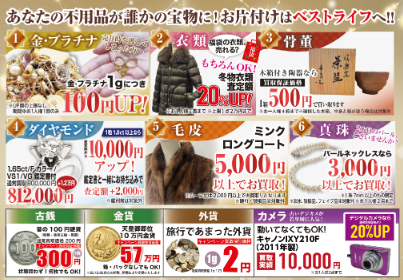 NEW 更新日:2025.12.14 ベストライフ 0120-43-0308 大掃除応援キャンペーン♪ 大掃除応援キャンペーン♪ 年末の大掃除すすんでいますか? ずっと置いたままになっているお品物 もしかすると高価買取の可能性も!? あなたのお部屋に意外なお宝があるかもしれません。。。 キャンペーン、買取保証、各種ご用意ございます♪ 詳しくはHPをご覧ください(^^)v 年末のお片付けは是非ベストライフへ♪ ベストライフHP 来店予約 お客様の声(Google口コミ) X この店舗のショップニュース 金券買取いたします♪ 切手の買取はお任せください♪