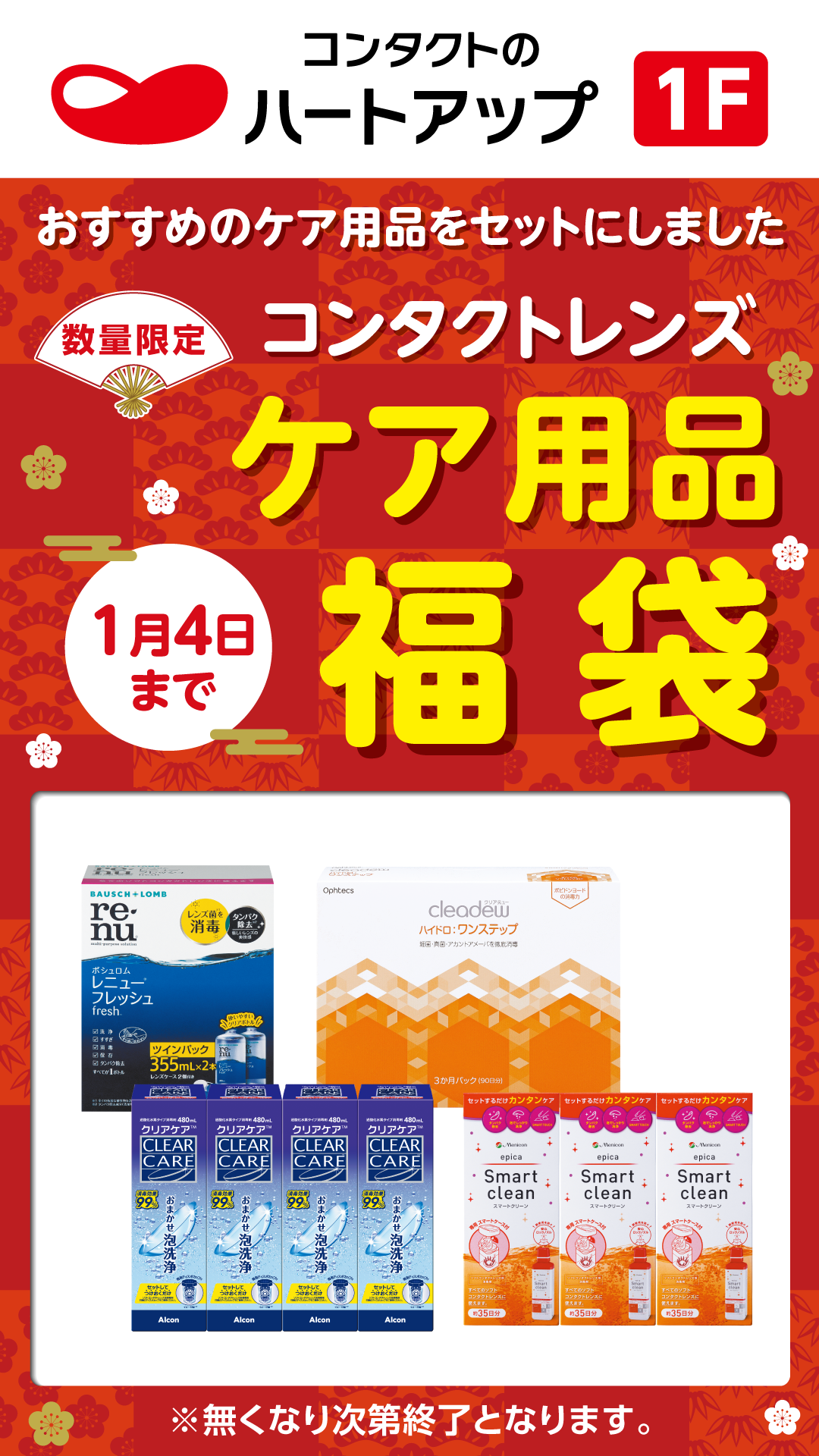 NEW 更新日:2026.01.01 ハートアップ 06-6649-3101 コンタクト洗浄液福袋 ハートアップ福袋開催中! コンタクトレンズ洗浄液がお得! アルコン AOセプトクリアケア福袋! オフテクス クリアデューハイドロ:ワンステップ福袋! など大人気の洗浄液の福袋を各種揃えています! 詳しくは店頭まで。 関連キーワード #BANG!BANG!BARGAIN! #福袋 X この店舗のショップニュース 天王寺・阿倍野でコンタクト買うなら! コンタクトレンズ40%OFF マカロニえんぴつ×ハートアップ 【天王寺・あべのでコンタクトレンズを買うなら】ウインターセール開催