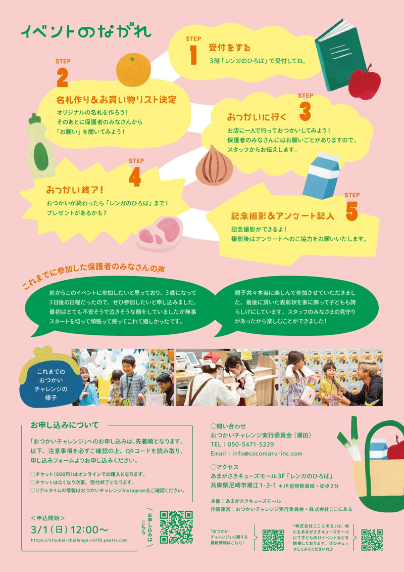 おつかいにチャレンジして大人への第一歩を踏み出してみて。保護者のみなさんにとってはお子さんの成長を感じられる機会にきっとなるので、ぜひ一緒にご参加くださいね。