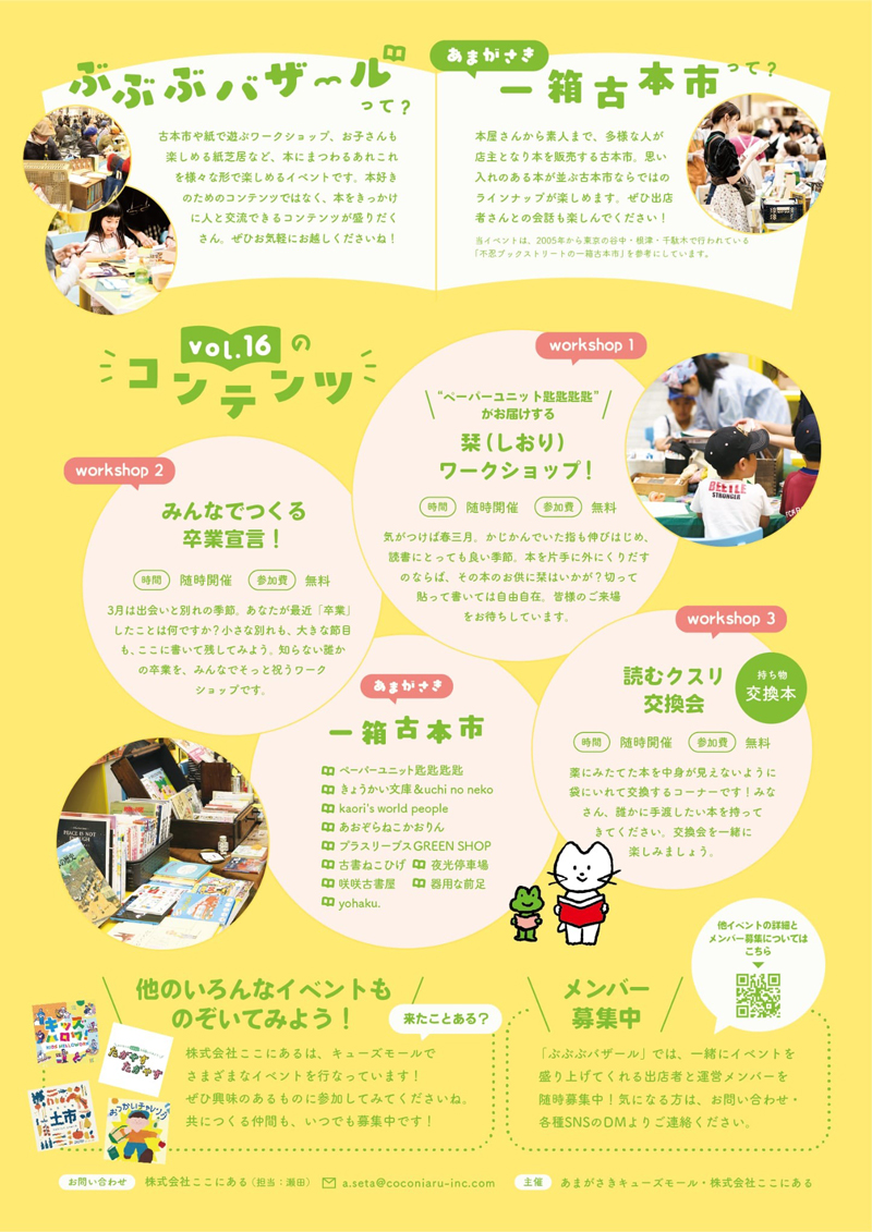 古本市や紙で遊ぶワークショップ、お子さんも楽しめる紙芝居など、本にまつわるあれこれを様々な形で楽しめるイベントです。本好きのためのコンテンツではなく、本をきっかけに人と交流できるコンテンツが盛りだくさん。ぜひお気軽にお越しくださいね!