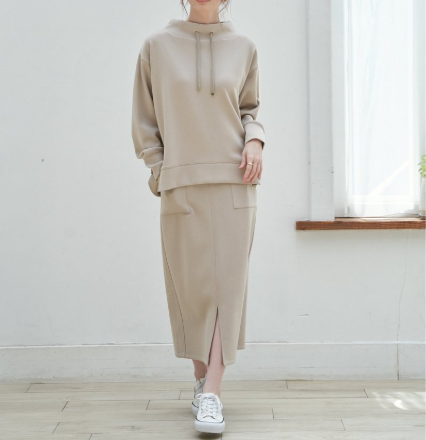 ・首元にきれいに沿ったモックネックはカジュアル過ぎず大人な雰囲気の抜け感を演出