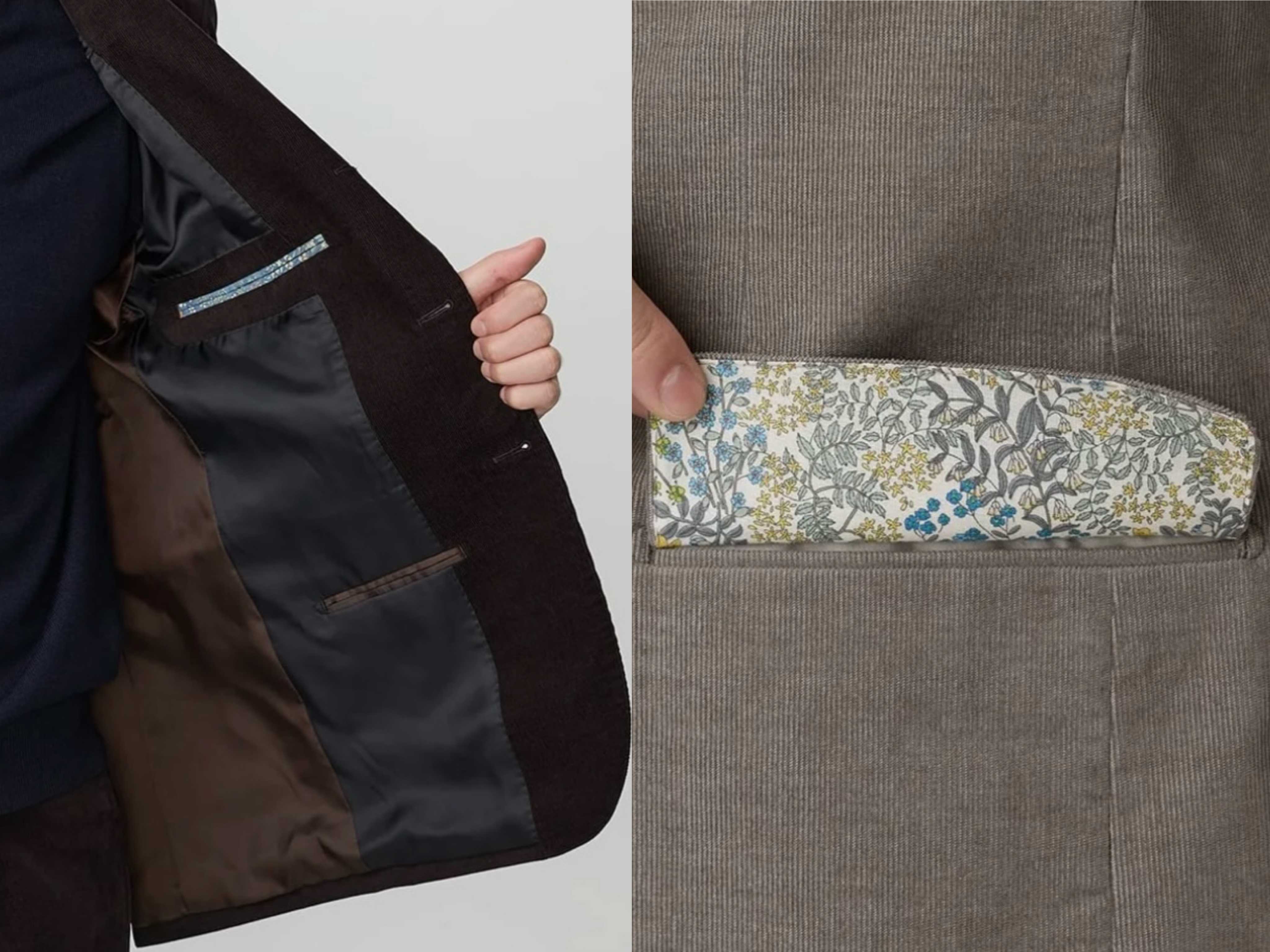 フラップ裏や内ポケット口にはフラワープリントを取り入れて、