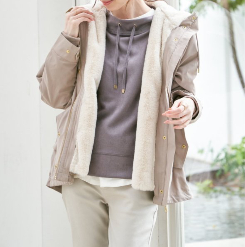 ライナーはフェイクファーと中綿キルトの切り替えデザインで、着心地も見た目もあたたか。