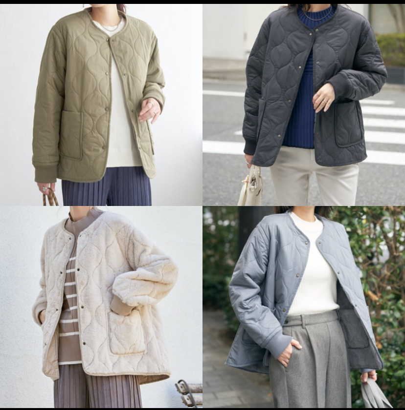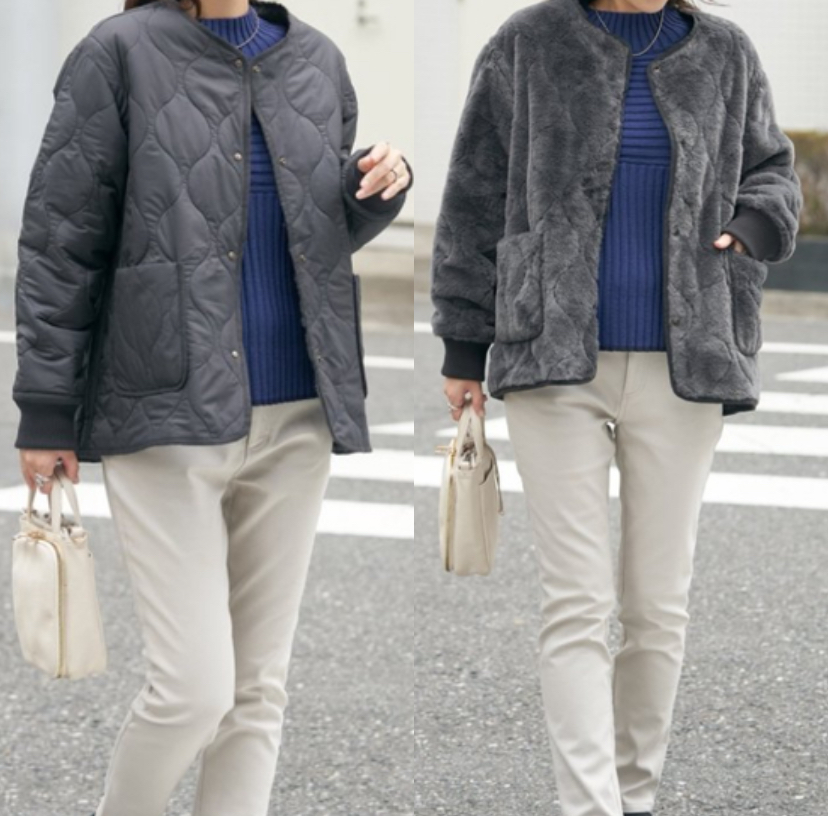すっきりとしたキルト面と、ふんわりあたたかなフェイクファー面のリバーシブル仕様で、着こなしの幅がぐっと広がります。