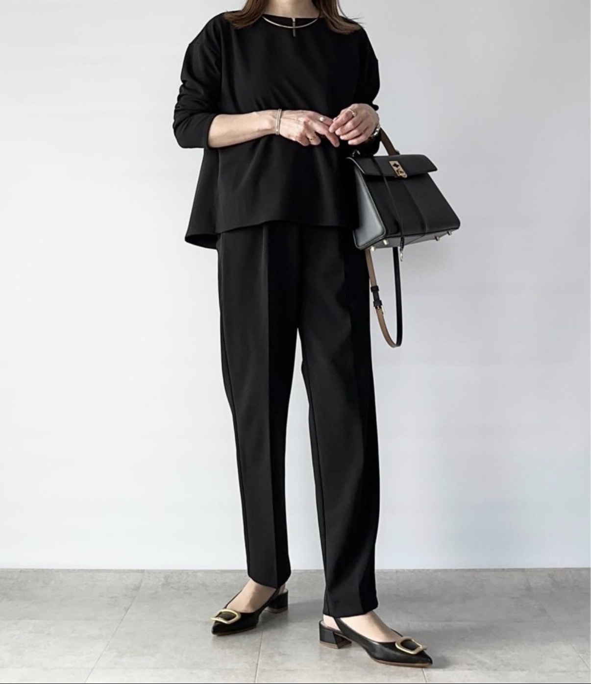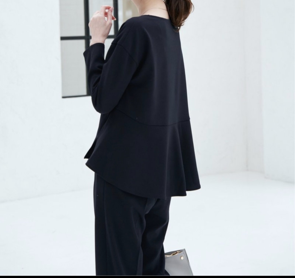 ペプラム切替えのトップスとシンプルなテーパードパンツのセットアップです。