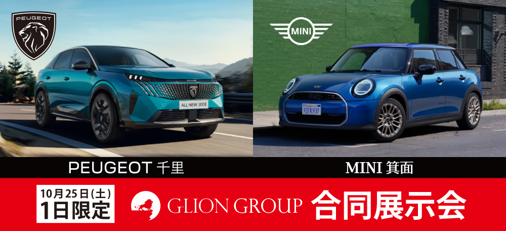 10月25日(土)、1日限定でGLION GROUPの車両展示会を開催いたします。当日はMINI箕面/PEUGEOT千里/BMW箕面支店から話題の新車モデルが大集合!