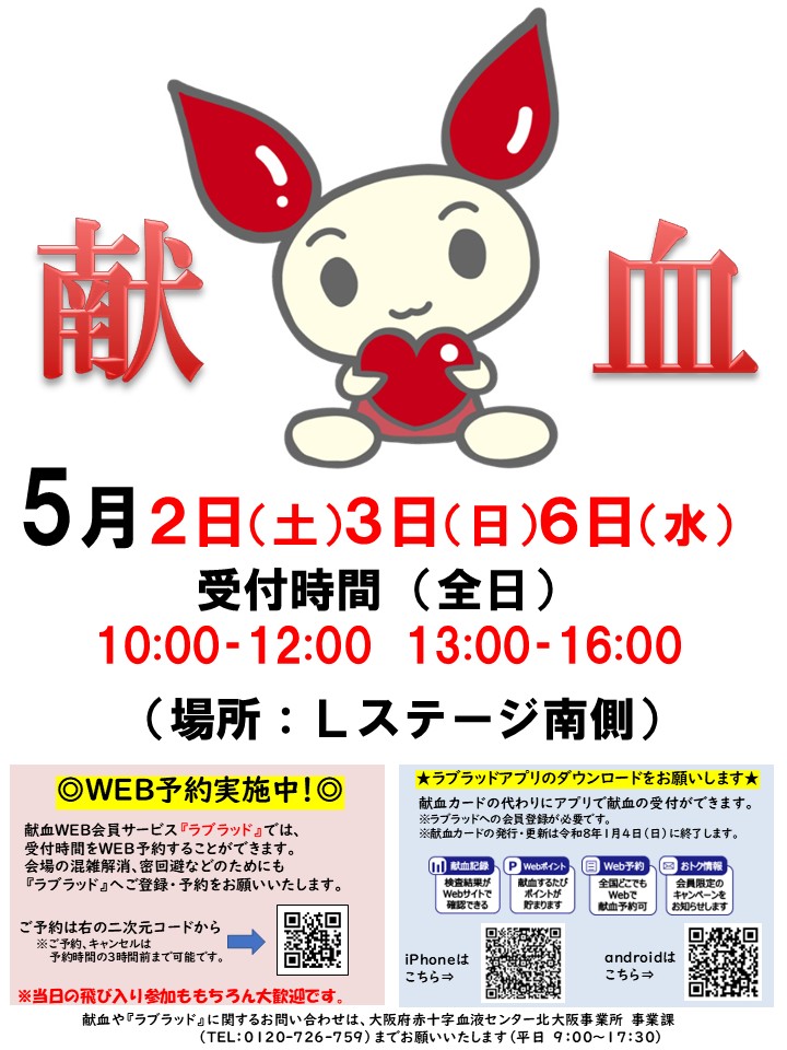 ※コロナ対策として、ラブラッド会員による「事前予約」を行っています。 (献血当日は「事前予約」の方を優先して案内する場合がございます。ご了承ください。)