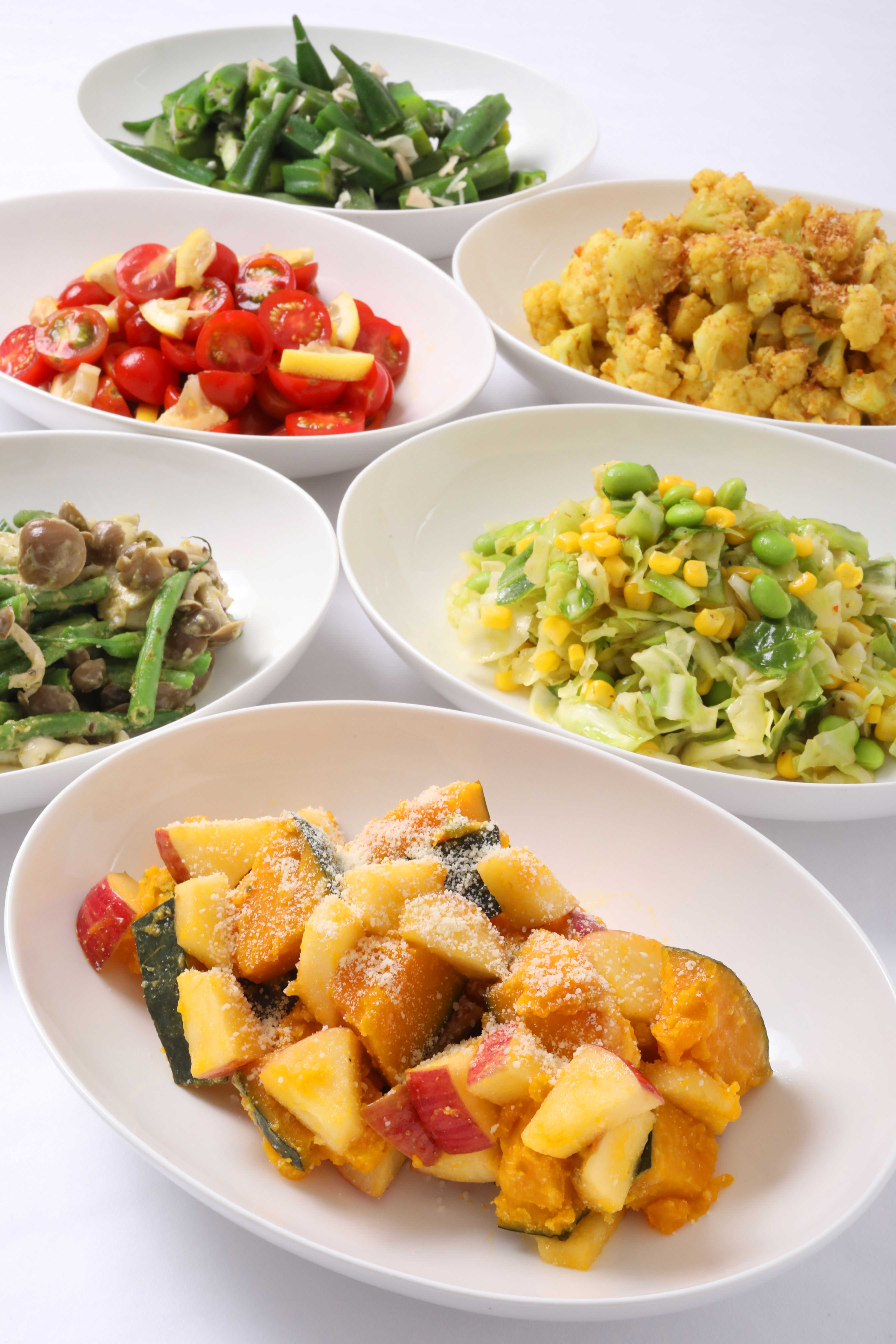 ※一部メニュー対象外1/2日分の野菜=175gの野菜タニタカフェのサラダは、柔らかい食感の葉物や、コリコリ食感の人参やブロッコリー、カリフラワー、シャキッとした紫キャベツやパプリカなど、異なる食感や大きさのお野菜をたっぷり100g、7種類使用しています。