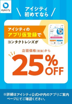 \アイシティ初めてなら/アプリ仮登録でコンタクトレンズが店頭価格(税抜)から25%OFF!
