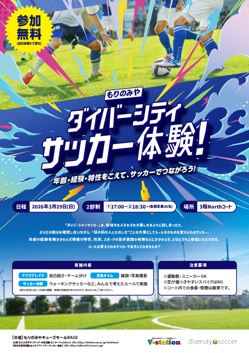 - もりのみやキューズモールBASE、大阪公立大学ボランティア・市民活動センターV-station、特定非営利活動法人ダイバーシティサッカー協会